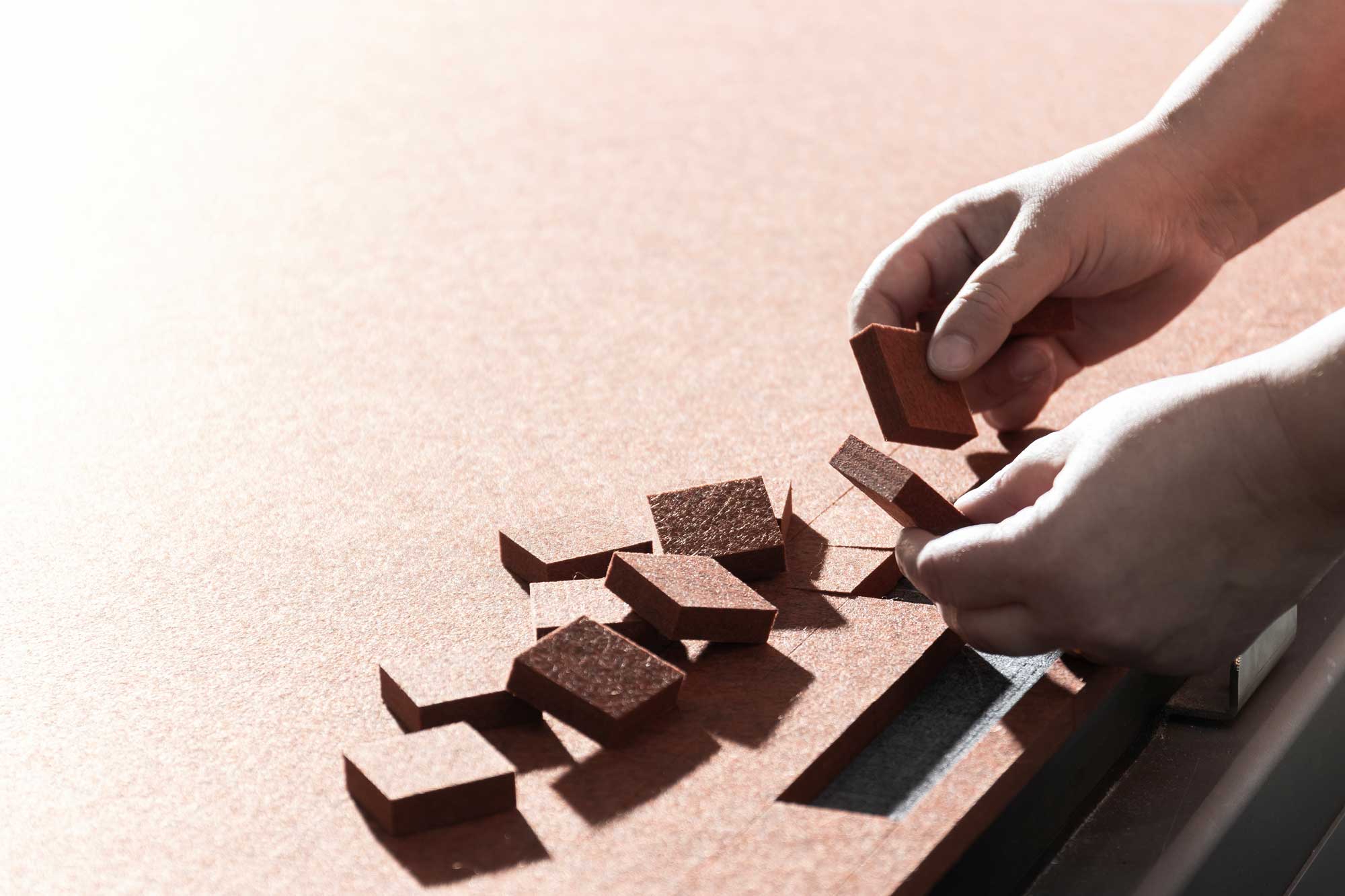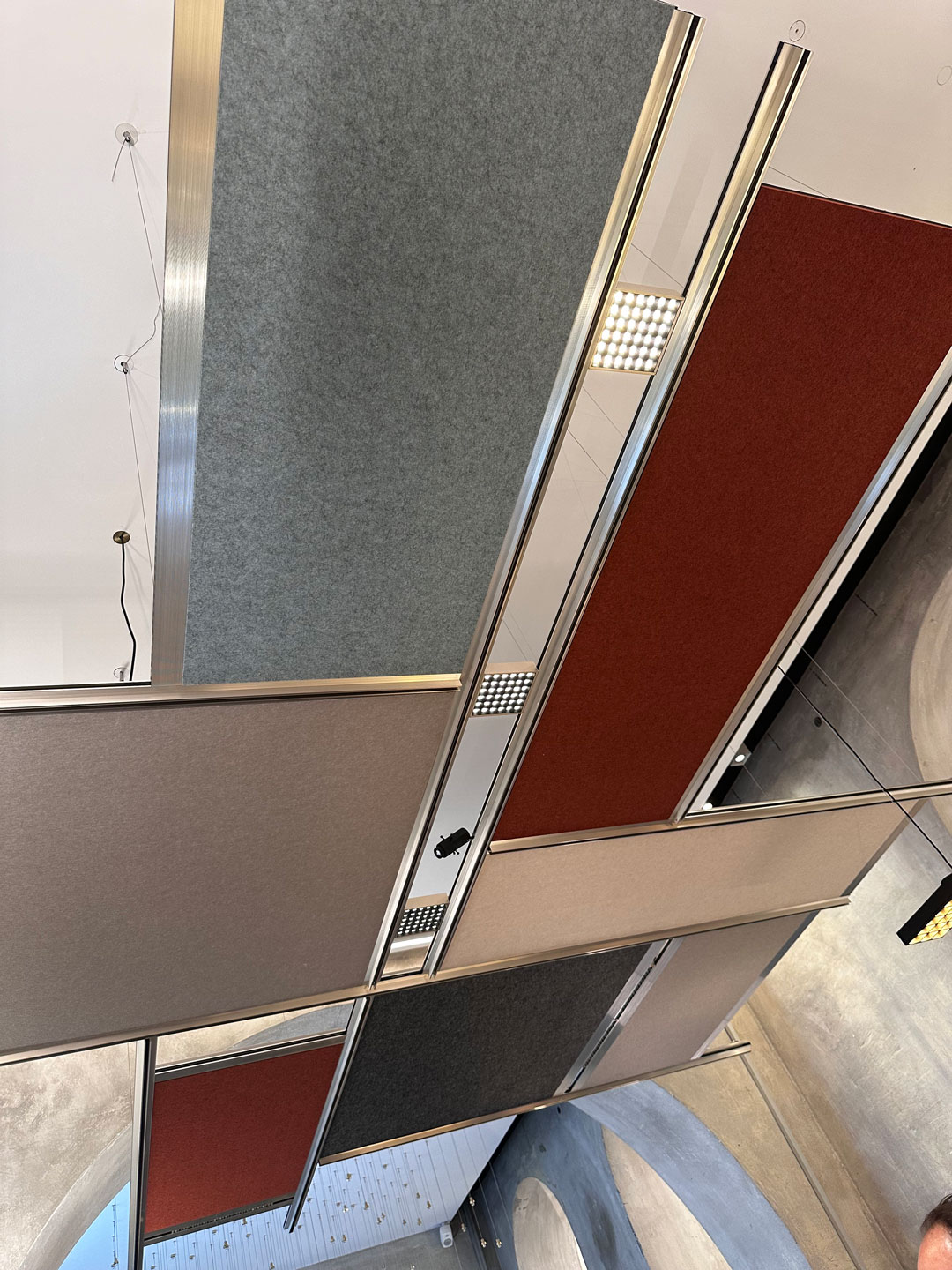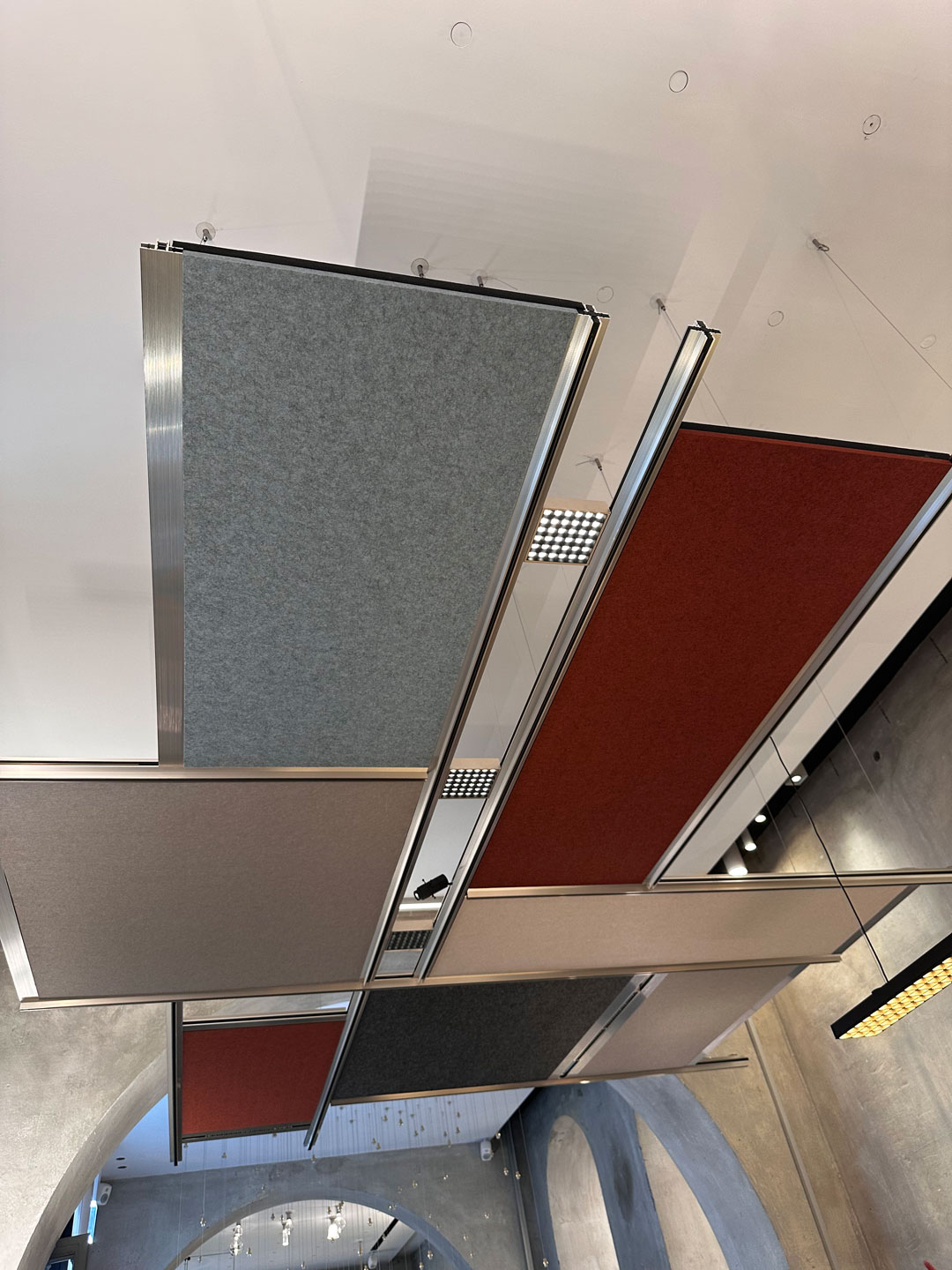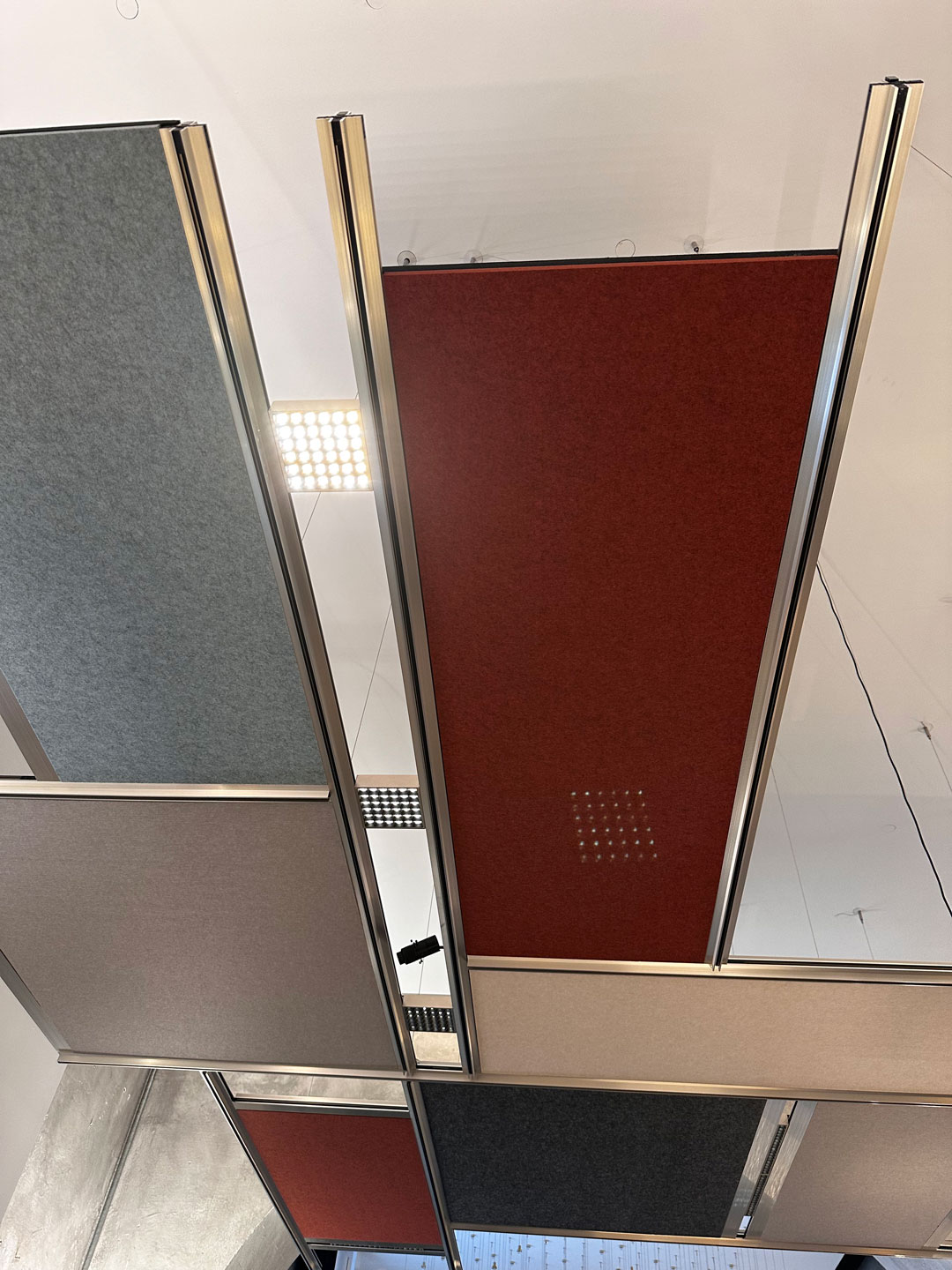 - Sound-absorbing, impact and moisture resistant panels made of high-density, 100% recycled polyester fiber, with color of choice from the catalog.